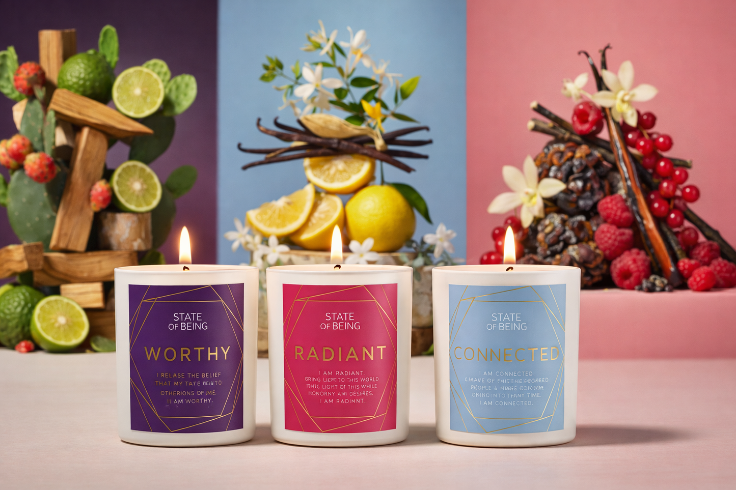First, you'll condition your brain to connect your candle's scent and the affirmation. Each candle comes with easy instructions! Once you do that, you can light your candle to recall and recenter your thoughts on your desired State of Being!